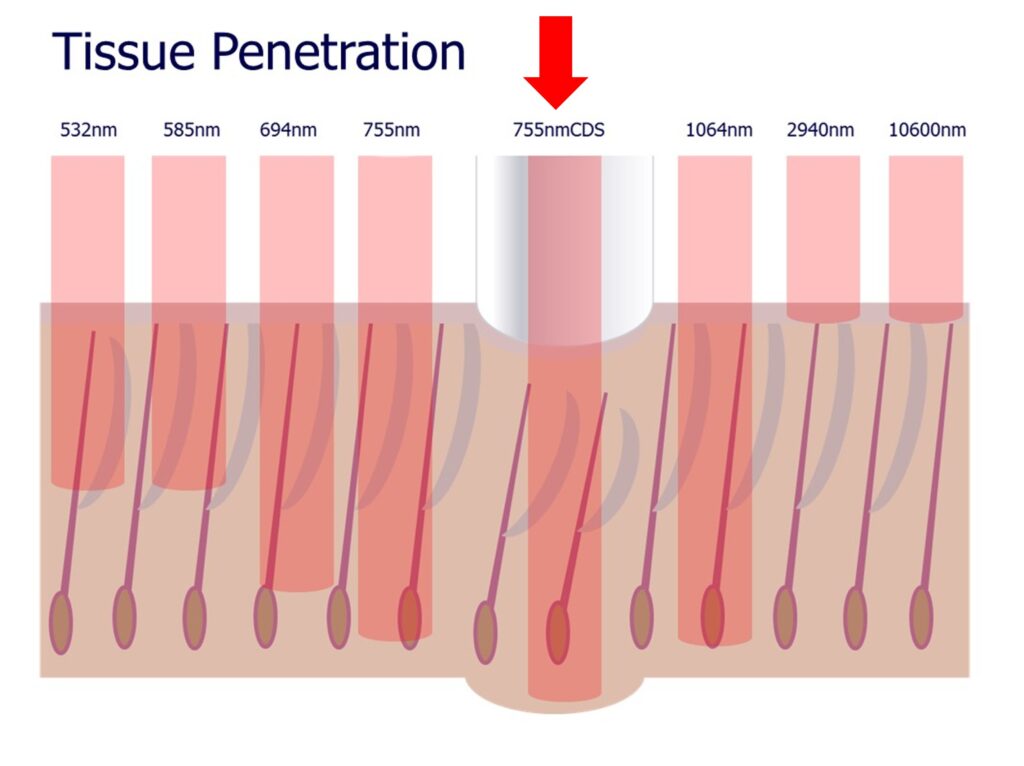 これらの波長のラインナップから見ても、755nmという波長は色素疾患治療と脱毛治療の双方において中心的な存在であり、非常にバランスの取れた波長であることが分かります。