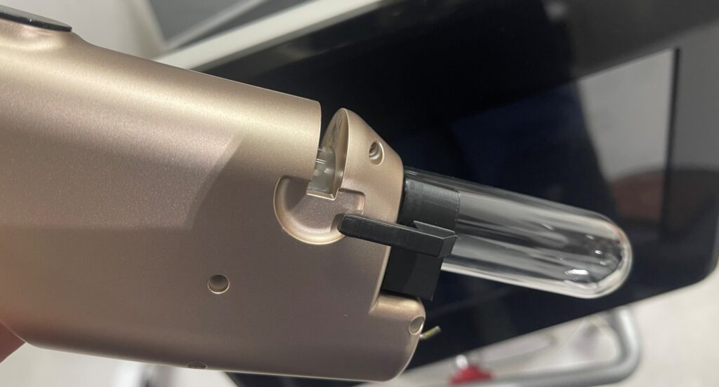 ALEX-Qにもガラス管が適用できるように試行錯誤の末、デバイスホルダーを作成し、同様に治療が行えるように仕上げました。